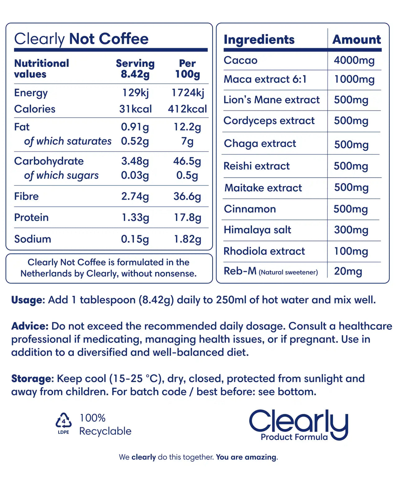 Not Coffee is completely natural and contains no added sugars. With only a minimal amount of caffeine from cacao (9 mg), you can say goodbye to caffeine crashes and enjoy a calm, alert, and sharp mind without disrupting your sleep.