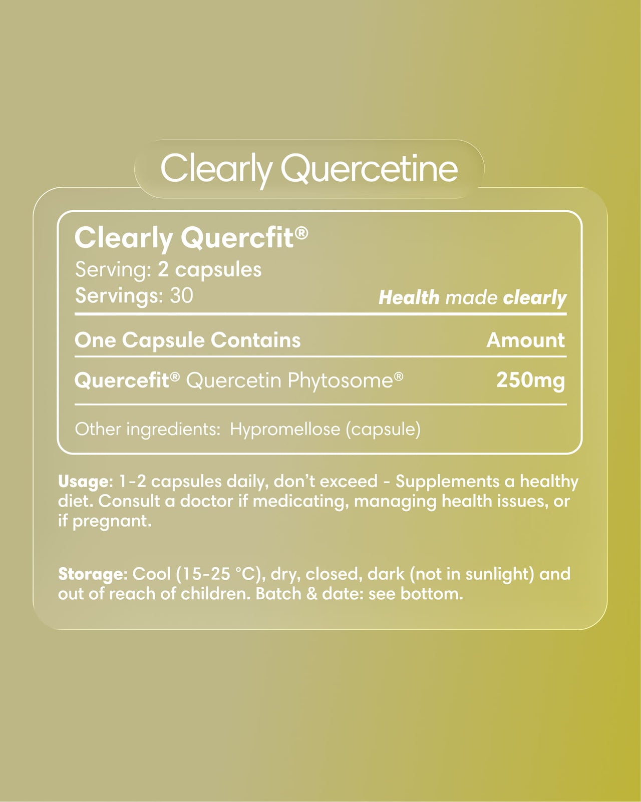 Take 1–2 capsules daily with water, preferably during or after a meal. Since quercetin is fat-soluble, taking it with food helps your body absorb it better.
